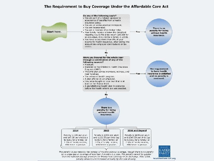 Individual Mandates Starting in 2014 require most Americans to have minimum level of health insurance or else pay a penalty. • Penalty: In 2014, $95 a year or 0. 5% of a household’s income, whichever is greater; in 2015, $495 or 1% of income; in 2016, $750 or 2% of income (maximum of $2, 250 for a family). Penalty adjusted for inflation after 2016. • Exemptions: American Indians; people with religious objections; people with financial hardship; people without coverage <= 3 months; households with income below 100 % of FPL ($22, 050 / family of 4 in 2009); households paying > 8% of income on premiums for the cheapest available