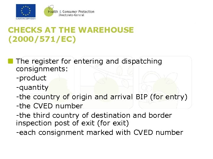 CHECKS AT THE WAREHOUSE (2000/571/EC) The register for entering and dispatching consignments: -product -quantity -the country of origin and arrival BIP (for entry) -the CVED number -the third country of destination and border inspection post of exit (for exit) -each consignment marked with CVED number