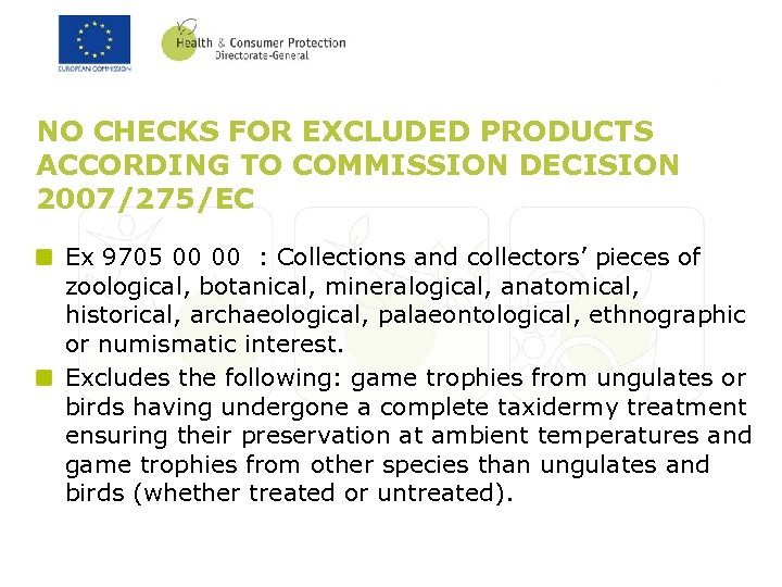 NO CHECKS FOR EXCLUDED PRODUCTS ACCORDING TO COMMISSION DECISION 2007/275/EC No checks for products if they are excluded, for instance: 0505 Skins and other parts of birds, with their feathers or down etc. are all checked, excluding treated decorative feathers, treated feathers carried by travellers for their private use or consignments of treated feathers sent to private individuals for non industrial purposes This is the only exception concerning personal import