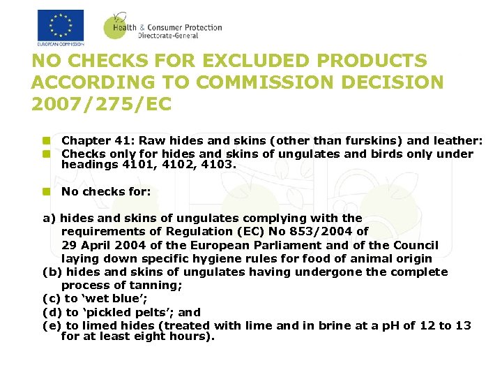 NO CHECKS FOR EXCLUDED PRODUCTS ACCORDING TO COMMISSION DECISION 2007/275/EC Chapter 41: Raw hides and skins (other than furskins) and leather: Checks only for hides and skins of ungulates and birds only under headings 4101, 4102, 4103. No checks for: a) hides and skins of ungulates complying with the requirements of Regulation (EC) No 853/2004 of 29 April 2004 of the European Parliament and of the Council laying down specific hygiene rules for food of animal origin (b) hides and skins of ungulates having undergone the complete process of tanning; (c) to ‘wet blue’; (d) to ‘pickled pelts’; and (e) to limed hides (treated with lime and in brine at a p. H of 12 to 13 for at least eight hours).