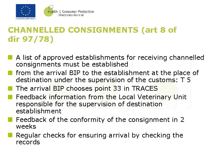 CHANNELLED CONSIGNMENTS (art 8 of dir 97/78) A list of approved establishments for receiving channelled consignments must be established from the arrival BIP to the establishment at the place of destination under the supervision of the customs: T 5 The arrival BIP chooses point 33 in TRACES Feedback information from the Local Veterinary Unit responsible for the supervision of destination establishment Feedback of the conformity of the consignment in 2 weeks Regular checks for ensuring arrival by checking the records
