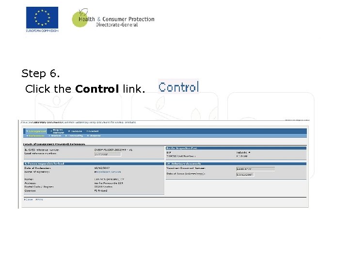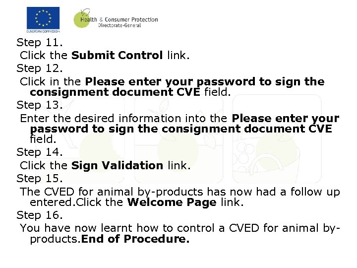 Step 11. Click the Submit Control link. Step 12. Click in the Please enter your password to sign the consignment document CVE field. Step 13. Enter the desired information into the Please enter your password to sign the consignment document CVE field. Step 14. Click the Sign Validation link. Step 15. The CVED for animal by-products has now had a follow up entered. Click the Welcome Page link. Step 16. You have now learnt how to control a CVED for animal byproducts. End of Procedure.