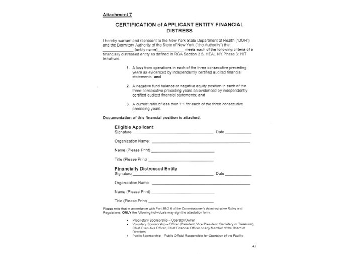 Requirement to Certify that: · I will make every effort to ensure that the applicant will be consistent with the goals and recommendations, when available, of the Commission on Health Care Facilities in the Twenty-First Century, as established pursuant to Section 31 of Part E of Chapter 63 of the Laws of 2005. · I will make every effort to ensure that the applicant will design a project which is interoperable and adheres to the national standards for their type of Project. · I certify that the work covered by the Grant Disbursement Agreements (“GDAs”) shall be deemed “public work” subject to and in accordance with Articles 8, 9 and 10 of the Labor Law, if applicable. · I certify that the applicant will collaborate with other grant recipients in their region and with the Department of Health on the development of statewide standards. · I certify that the information contained in this application and attached materials are accurate and true. · I certify that the funds received pursuant to subdivision 1 of section 2818 of the Public Health Law will be expended solely for the purposes for which the monies were awarded under the RGA for _________________. Attachment 6 (Name of Facility)