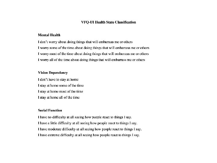 VFQ-UI - 6 item subset of NEI VFQ-25 (11 scales) - general vision, near vision, distance vision, driving, peripheral vision, color vision, ocular pain, role function, dependency, social function, mental health - 8 vision-related health states ranging from no difficulty to stopped doing work - TTOs from sample of 607 from Australia, Canada, U and U. S. ranged from 0. 34 -0. 96