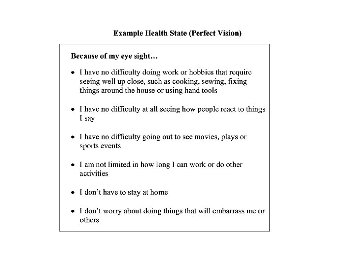 Why Estimate Preferences from Disease-targeted Measure? - Direct or other indirect preference measure not administered. - Indirect preference measure was administered but is insensitive to important aspects of HRQOL for given condition - e. g. , EQ-5 D not associated with VA or contrast sensitivity in persons with macular degeneration