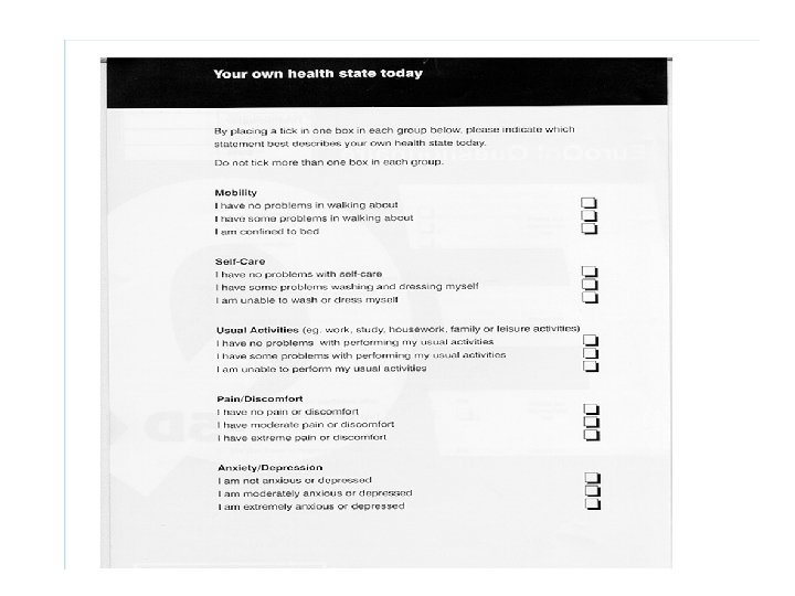 Mapping Health States to Preference Score Exists Measured P 3, M 3 Perfect HRQOL 0. 9 P 2, M 3 0. 8 P 3, M 2 0. 7 P 3, M 1 0. 6 P 2, M 2 0. 5 P 1, M 3 P 2, M 1 0. 4 0. 3 P 1, M 2 P 1, M 1 0. 2 0. 1 Dead