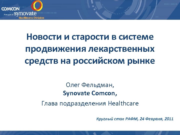Healthcare Division Новости и старости в системе продвижения лекарственных средств на российском рынке Олег Фельдман, Synovate Comcon, Глава подразделения Healthcare Круглый стол РАФМ, 24 Февраля, 2011