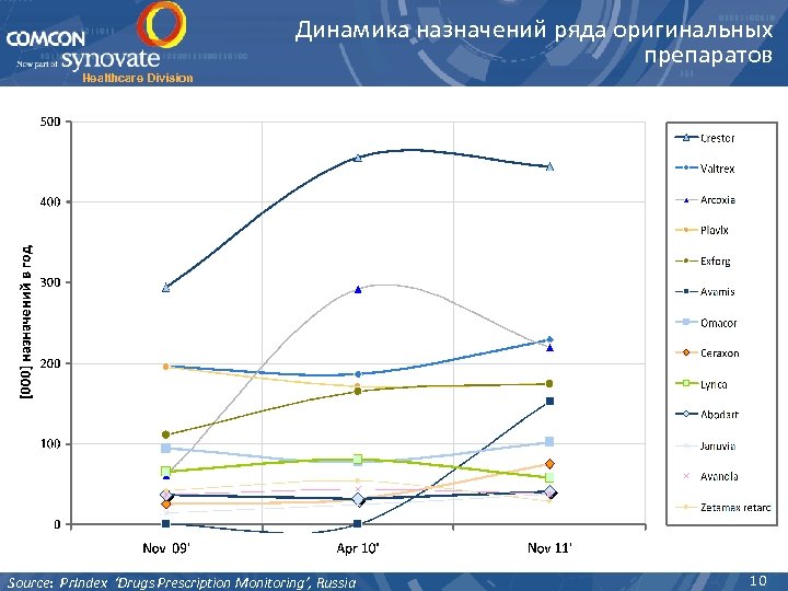 Динамика назначений ряда оригинальных препаратов Healthcare Division Source: Pr. Index ‘Drugs Prescription Monitoring’, Russia 10