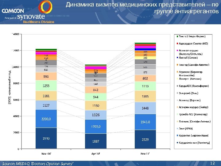 Динамика визитов медицинских представителей по ряду оригинальных препаратов– Healthcare Division Source: MEDI-Q ‘Doctors Opinion Survey’ 11