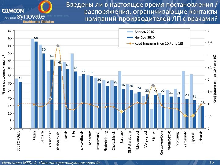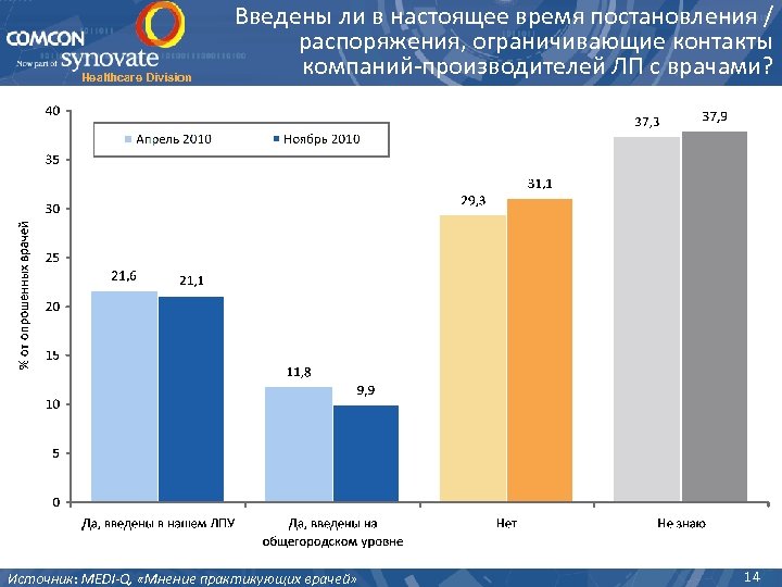 Healthcare Division Введены ли в настоящее время постановления / распоряжения, ограничивающие контакты компаний-производителей ЛП с врачами? Источник: MEDI-Q, «Мнение практикующих врачей» 14