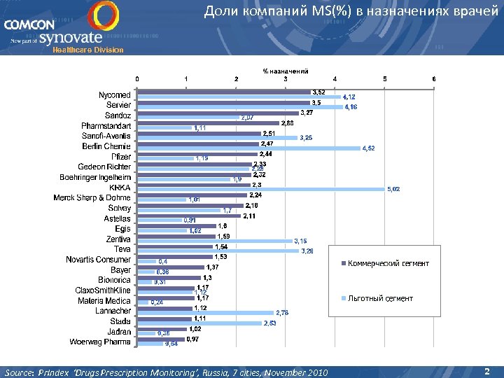 Доли компаний MS(%) в назначениях врачей Healthcare Division Source: Pr. Index ‘Drugs Prescription Monitoring’, Russia, 7 cities, November 2010 2