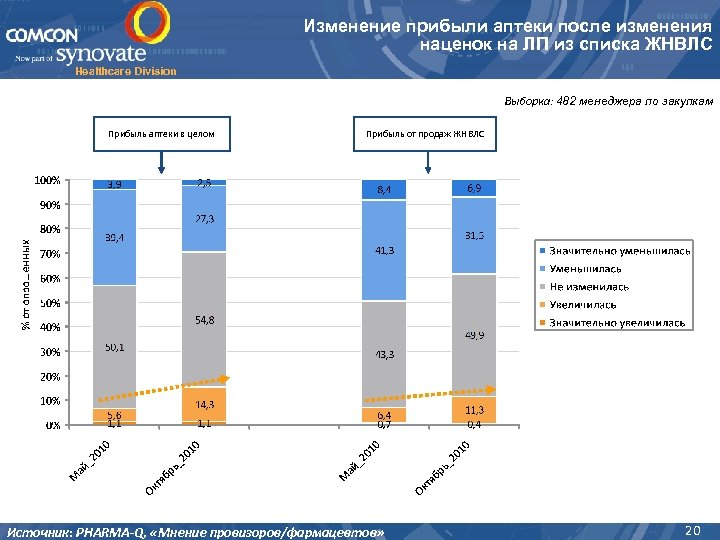 Изменение цен на ЛП у дистрибьюторов и в аптеке Healthcare Division Выборка: 482 менеджера по закупкам Цены на ЛП из списка ЖНВЛС у дистрибьюторов Цены на ЛП из списка ЖНВЛС в Вашей аптеке Цены на другие ЛП у дистрибьюторов Источник: PHARMA-Q, «Мнение провизоров/фармацевтов» Цены на другие ЛП в Вашей аптеке 19