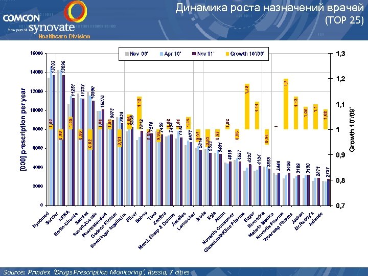 Динамика роста назначений врачей (ТОР 25) Healthcare Division Source: Pr. Index ‘Drugs Prescription Monitoring’, Russia, 7 cities