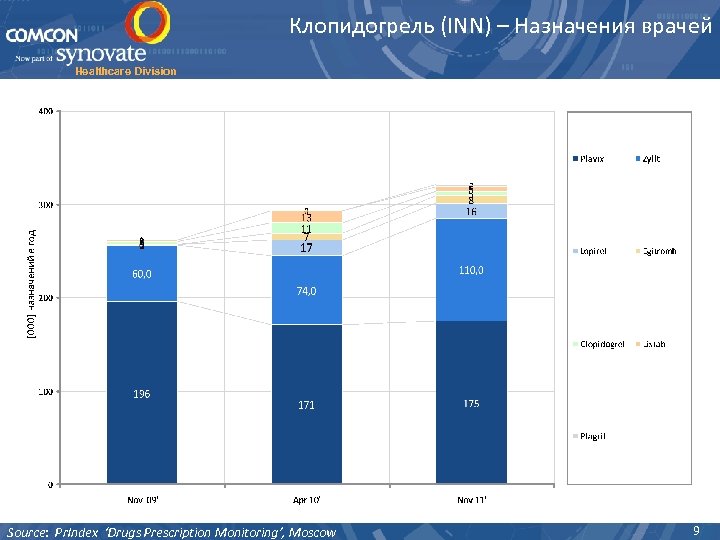 Клопидогрель (INN) – Назначения врачей Healthcare Division Source: Pr. Index ‘Drugs Prescription Monitoring’, Moscow 9
