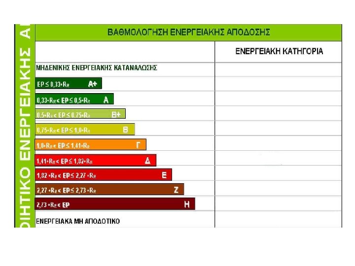 Energy Efficiency in various Building Categories Category Limit Α+ ΕΡ ≤ 0, 33 RR Category Limit T ≤ 0, 33 Α 0, 33 RR < ΕΡ ≤ 0, 50 RR 0, 33 < T ≤ 0, 50 Β+ 0, 50 RR < ΕΡ ≤ 0, 75 RR 0, 50 < T ≤ 0, 75 Β 0, 75 RR < ΕΡ ≤ 1, 00 RR 0, 75 < T ≤ 1, 00 Γ 1, 00 RR < ΕΡ ≤ 1, 41 RR 1, 00 < T ≤ 1, 41 Δ 1, 41 RR < ΕΡ ≤ 1, 82 RR 1, 41 < T ≤ 1, 82 Ε 1, 82 RR < ΕΡ ≤ 2, 27 RR 1, 82 < T ≤ 2, 27 Ζ 2, 27 RR < ΕΡ ≤ 2, 73 RR 2, 27 < T ≤ 2, 73 Η 2, 73 RR < ΕΡ 2, 73 < T