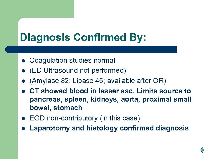 Diagnosis Confirmed By: l l l Coagulation studies normal (ED Ultrasound not performed) (Amylase 82; Lipase 45; available after OR) CT showed blood in lesser sac. Limits source to pancreas, spleen, kidneys, aorta, proximal small bowel, stomach EGD non-contributory (in this case) Laparotomy and histology confirmed diagnosis