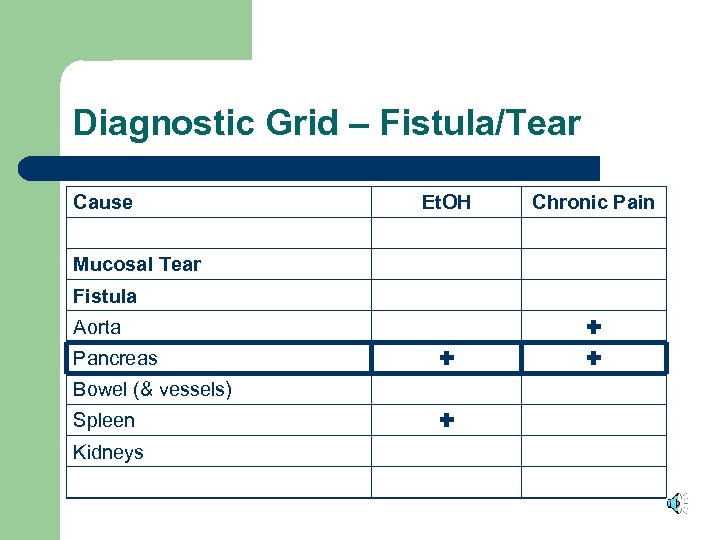 Diagnostic Grid – Fistula/Tear Cause Et. OH Chronic Pain Mucosal Tear Fistula Aorta Pancreas Bowel (& vessels) Spleen Kidneys