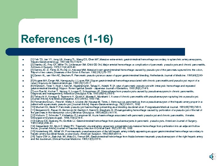 References (1 -16) l l l l [1] Yeh TS, Jan YY, Jeng LB, Hwang TL, Wang CS, Chen MF, Massive extra-enteric gastrointestinal hemorrhage secondary to splanchnic artery aneurysms, Hepato-Gastroenterology. 1997; 44(16): 1152 -6. [2] Stanley JC, Frey CF, Miller TA, Lindenauer SM. Child CG 3 rd, Major arterial hemorrhage: a complication of pancreatic pseudocysts and chronic pancreatitis. Archives of Surgery, 1976; 111(4): 435 -40. [3] Santos JC Jr, Feres O, Rocha JJ, Aracava MM. Massive lower gastrointestinal hemorrhage caused by pseudocyst of the pancreas ruptured into the colon, Report of two cases, Diseases of the Colon & Rectum. 1992; 35(1): 75 -? ? ? [4] Zanen AL, van Vliet AC, Beukers R. Pancreatic pseudocyst as a cause of upper gastrointestinal bleeding. Netherlands Journal of Medicine. 1995; 46(2): 904. [5] Nogara MA, Cesar AM, Kanegusuku J, Lopes RW. [Upper gastrointestinal hemorrhage associated with chronic pancreatitis and pseudocyst: report of a case. ] Arquivos de Gastroenterologia. 1993; 30(1): 33 -7. [6] Nishida K, Terai Y, Nojiri I, Kato M, Higashijima M, Takagi K, Adashi R. [A case of pancreatic pseudocyst with intracystic hemorrhage and repeated gastrointestinal bleeding]. Nippon Ronen Igakkai Zasshi - Japanese Journal of Geriatrics. 1993; 30(8): 714 -9. [7] von Flue M, Kocher T, Herzog U, Looser C, Schuppisser JP. [Hemorrhage from pseudocysts caused by pseudoaneurysms in chronic pancreatitis. Diagnosis and management]. Helvetica Chirurgica Acta. 1993; 59(5 -6): 785 -9. [8] Takeuchi H. Konaga E. Tanemoto K. Gotoh K. Murata K. Murakami I. A case of chronic pancreatitis with pseudoaneurysm rupturing into a pseudocyst. [Journal Article] Acta Medica Okayama. 47(1): 59 -62, 1993 Feb. [9] Fernandez-Cruz L. Pera M. Vilella A. Llovera JM. Navasa M. Teres J. Hemosuccus pancreaticus from a pseudoaneurysm of the hepatic artery proper in a patient with a pancreatic pseudocyst. [Journal Article] Hepato-Gastroenterology. 39(2): 149 -51, 1992 [10] Muckart DJ, Bade P. Pancreatic pseudocyst haemorrhage presenting as a bleeding duodenal ulcer. Postgraduate Medical Journal. 1989; 65(768): 748 -9. [11] Bergamini G, Repaci G, Bertoncini M, Garbini A, Nanni G, Bragherio G. [Exsanguinating hemorrhage caused by perforation of a pseudocyst of the tail of the pancreas in the transverse colon. ] Minerva Chirurgica. 1985; 40(20): 1411 -4. [12] Kiviluoto T, Schroder T, Kivilaakso E, Lempinen M. Acute haemorrhage associated with pancreatic pseudocyst and chronic pancreatitis. Annales Chirurgiae et Gynaecologiae. 1984; 73(4): 214 -8. [13] Cahow CE, Gusberg RJ, Gottlieb LJ. Gastrointestinal hemorrhage from pseudoaneurysms in pancreatic pseudocysts. American Journal of Surgery. 1983; 145(4): 534 -41. [14] Hassantash SA. Mock C. Maier RV. Traumatic visceral artery aneurysm: presentation as massive hemorrhage from perforation into an adjacent hollow viscus. [Journal Article] Journal of Trauma-Injury Infection & Critical Care. 38(3): 357 -60, 1995 [15] Kestenberg WL, Mittal VK. Post-traumatic pseudoaneurysm of the left hepatic artery initially appearing as upper gastrointestinal hemorrhage secondary to hepatic artery-duodenal fistula, a case study. American Surgeon. 1992; 58(8): 451 -4. [16] Taylor DW Jr, , Babchuk WI, Walz DJ, Vemuri BR, Gastrointestinal hemorrhage from fistula between traumatic pseudoaneurysm of the right hepatic artery and the duodenum, Clinical Nuclear Medicine. 1988; 13(5): 337 -8.