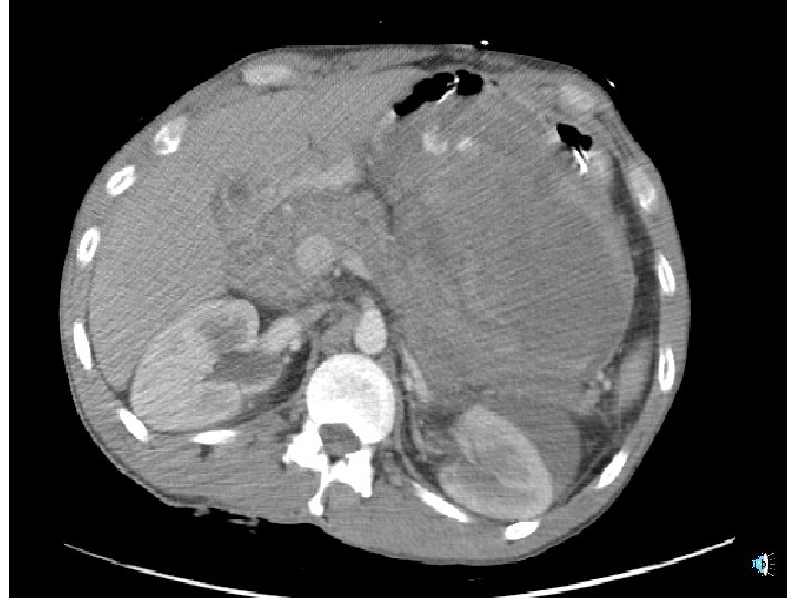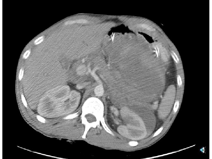 Hospital Course l l l Vitals remained stable after crystalloid and packed RBC infusions Contrast CT of the abdomen showed a heterogeneous collection in the lesser sac, consistent with a hematoma, measuring 15 x 12. 5 cm A small left perinephric hematoma was also identified