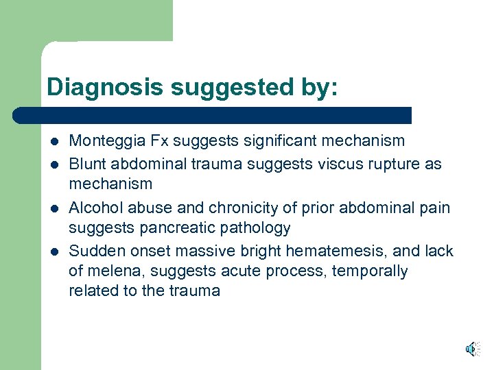 Diagnosis suggested by: l l Monteggia Fx suggests significant mechanism Blunt abdominal trauma suggests viscus rupture as mechanism Alcohol abuse and chronicity of prior abdominal pain suggests pancreatic pathology Sudden onset massive bright hematemesis, and lack of melena, suggests acute process, temporally related to the trauma