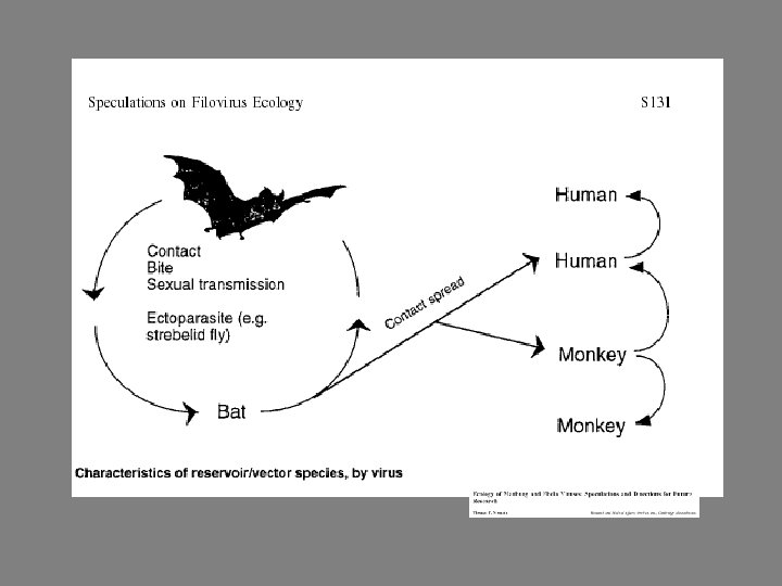 Reservoir • Not known • May be – A rare species – One that usually does not contact clinical host – If contact is made the virus may not be easily transmitted • Hypothesize – Bats – Plants