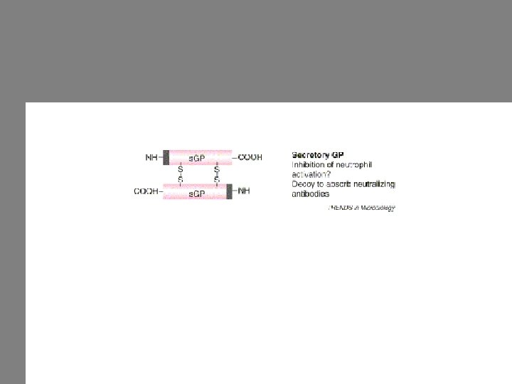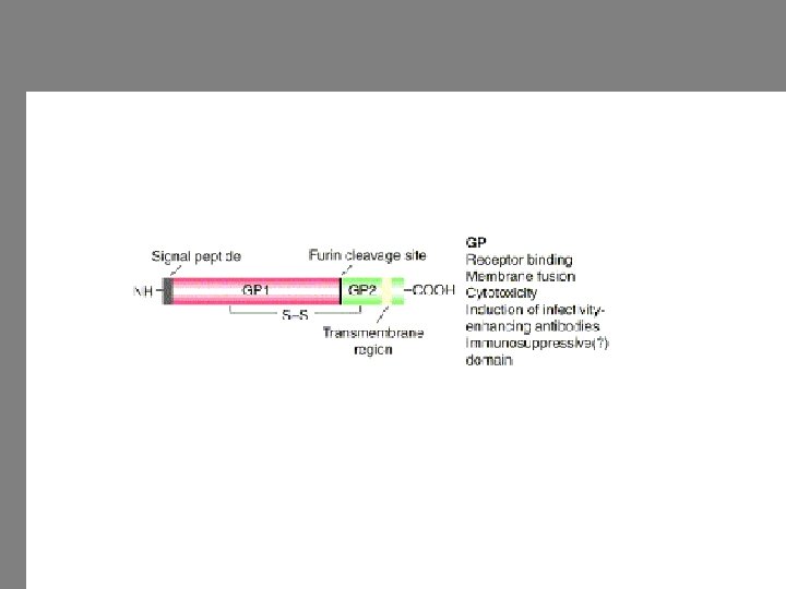 GP (Structural) • Formation of GP 1 -GP 2 Heterodimer In the trans-Golgi, the precursor molecule (GP 0) is post-translationally cleaved by furin at yielding a heterodimer, (GP 1 -GP 2) Furin cleavage site (Arg-X-Arg/LYS-Arg) (Marburg, cleavage site is more toward N-terminus) Heterodimer is linked together by one disulfide bond, a cysteine bridge