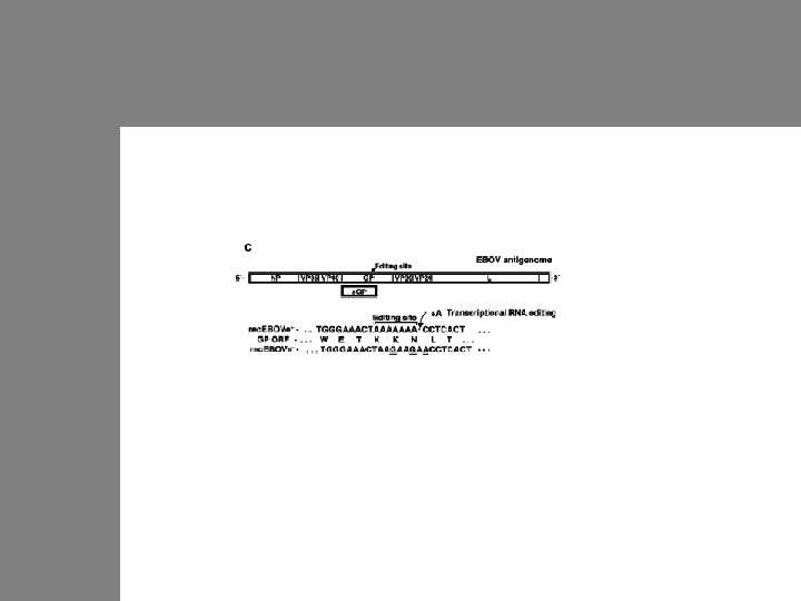 Reverse Transcription System Volchkov et al. contructed 2 recombinant EBOV clones 1. p. FL-EBOVe+ antigenomic c. DNA clone with authentic editing site 2. p. FL-EBOVe- antigenomic c. DNA clone with mutated editing site Eliminated editing site using site-directed mutagenesis Editing site in middle of GP gene AAAAAAA EBOV polyadenylation signal ATTAAGAAAAAA AAGAAGAA