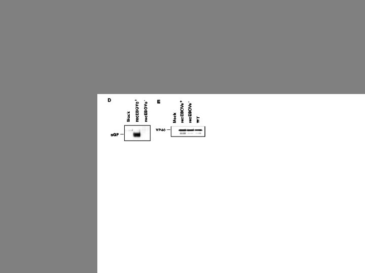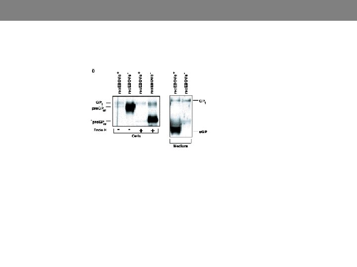 3. Differences in expression of the GP gene Wild Type – 1/5 GP, 4/5 s. GP p. FL-EBOVe+ - 1/5 GP, 4/5 s. GP p. FL-EBOVe- - no s. GP expression, increase in GP expression The increase in GP expression by p. FL-EBOVe- no simultaneous increase in virus release most of GP synthesized were immature precursors -with sugar side chains high in mannose -sensitive to treatment with endoglycosidase H -GP transport was arrested in ER or early Golgi