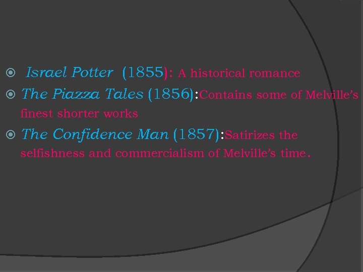 Israel Potter (1855): A historical romance The Piazza Tales (1856): Contains some of Melville’s finest shorter works The Confidence Man (1857): Satirizes the selfishness and commercialism of Melville’s time.