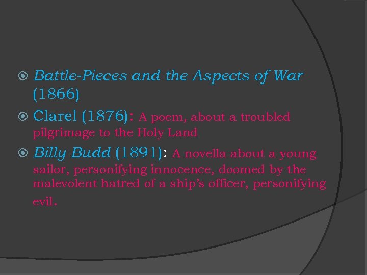 Battle-Pieces and the Aspects of War (1866) Clarel (1876): A poem, about a troubled pilgrimage to the Holy Land Billy Budd (1891): A novella about a young sailor, personifying innocence, doomed by the malevolent hatred of a ship’s officer, personifying evil.