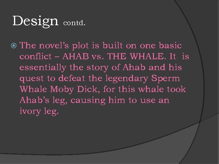 Design contd. The novel’s plot is built on one basic conflict – AHAB vs. THE WHALE. It is essentially the story of Ahab and his quest to defeat the legendary Sperm Whale Moby Dick, for this whale took Ahab’s leg, causing him to use an ivory leg.