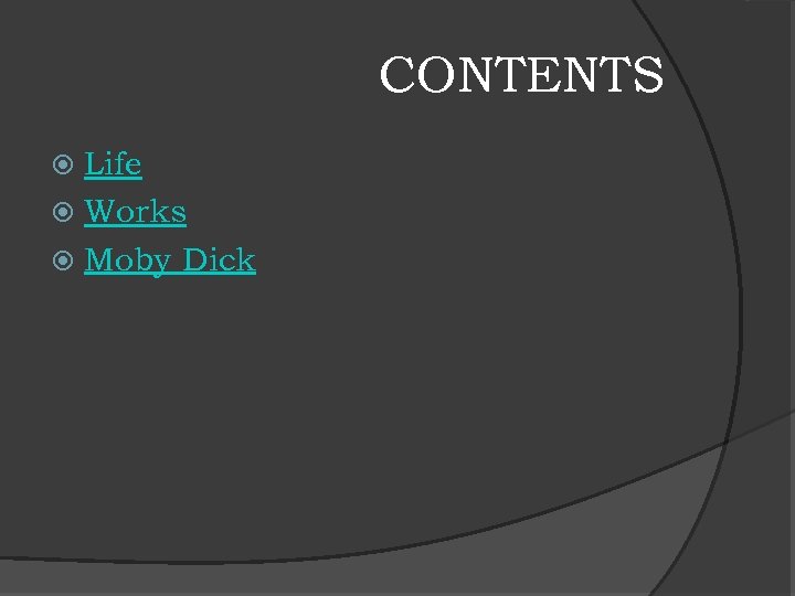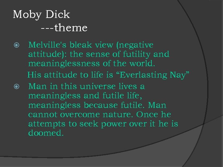 Moby Dick ---theme Melville's bleak view (negative attitude): the sense of futility and meaninglessness of the world. His attitude to life is “Everlasting Nay” Man in this universe lives a meaningless and futile life, meaningless because futile. Man cannot overcome nature. Once he attempts to seek power over it he is doomed.