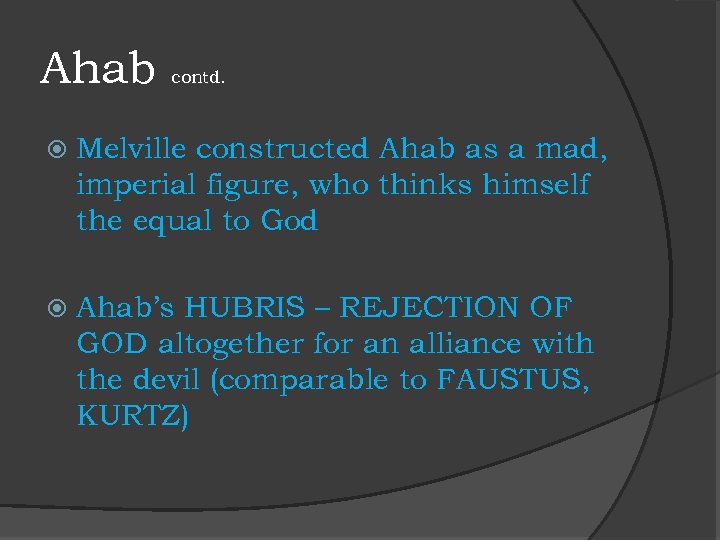Ahab contd. Melville constructed Ahab as a mad, imperial figure, who thinks himself the equal to God Ahab’s HUBRIS – REJECTION OF GOD altogether for an alliance with the devil (comparable to FAUSTUS, KURTZ)