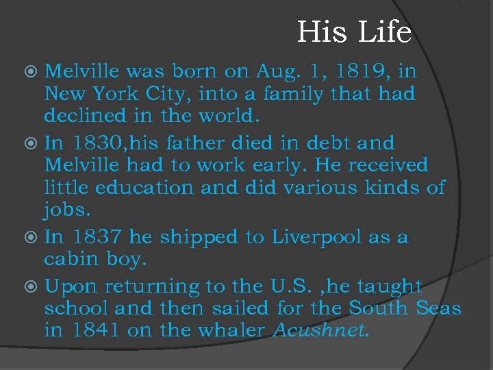His Life Melville was born on Aug. 1, 1819, in New York City, into a family that had declined in the world. In 1830, his father died in debt and Melville had to work early. He received little education and did various kinds of jobs. In 1837 he shipped to Liverpool as a cabin boy. Upon returning to the U. S. , he taught school and then sailed for the South Seas in 1841 on the whaler Acushnet.
