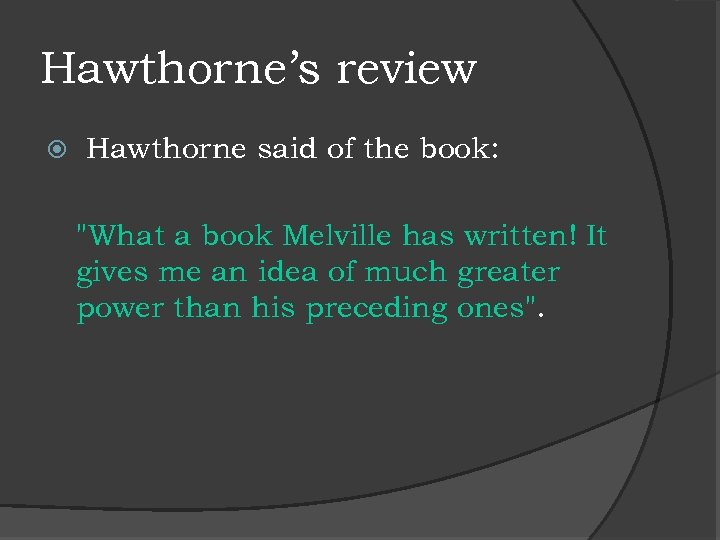 Hawthorne’s review Hawthorne said of the book: "What a book Melville has written! It gives me an idea of much greater power than his preceding ones".
