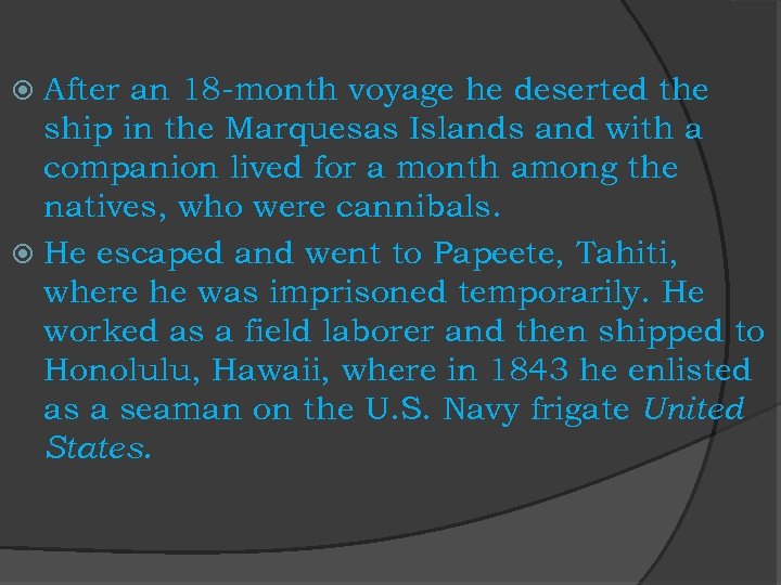 After an 18 -month voyage he deserted the ship in the Marquesas Islands and with a companion lived for a month among the natives, who were cannibals. He escaped and went to Papeete, Tahiti, where he was imprisoned temporarily. He worked as a field laborer and then shipped to Honolulu, Hawaii, where in 1843 he enlisted as a seaman on the U. S. Navy frigate United States.