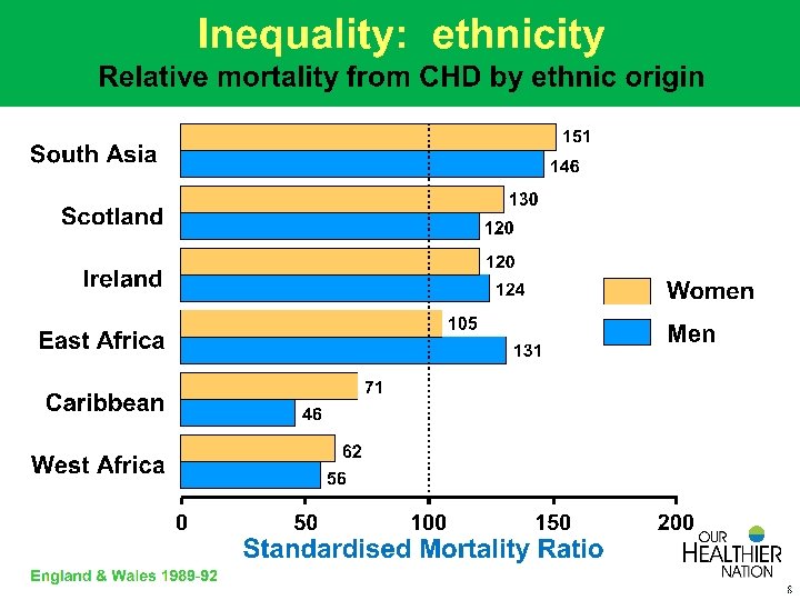 Mortality from Coronary Heart Disease men aged 20 -64 by social class England Wales 1991 -93 England Wales = 100 Social Class Professional Managerial Non-manual skilled Manual skilled Partly skilled Unskilled Standardised mortality ratios Source: Office for National Statistics (ONS), Health Inequalities