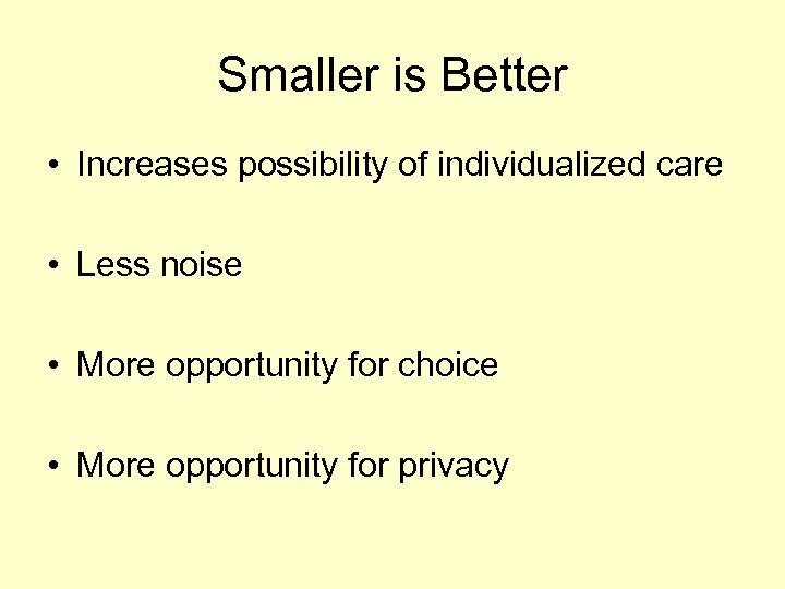 Smaller is Better • Increases possibility of individualized care • Less noise • More opportunity for choice • More opportunity for privacy