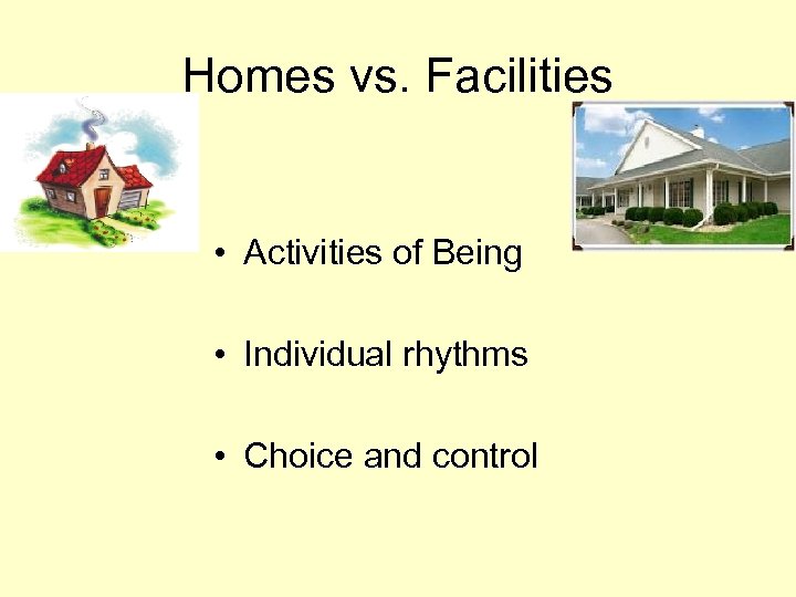 Homes vs. Facilities • Activities of Being • Individual rhythms • Choice and control