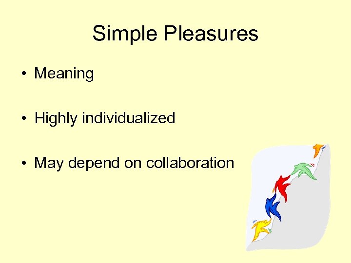 Simple Pleasures • Meaning • Highly individualized • May depend on collaboration