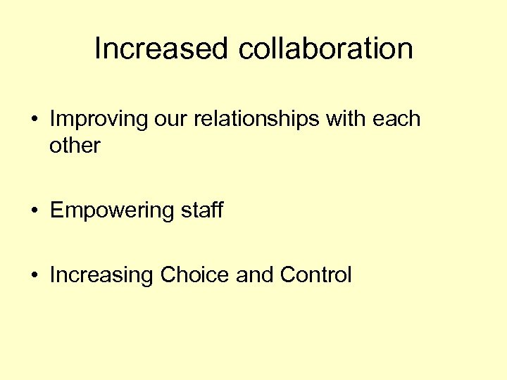 Increased collaboration • Improving our relationships with each other • Empowering staff • Increasing Choice and Control