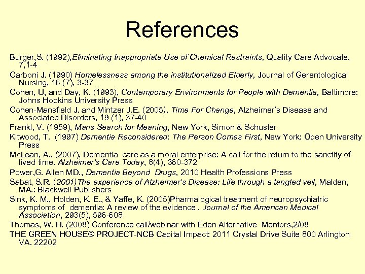 References Burger, S. (1992), Eliminating Inappropriate Use of Chemical Restraints, Quality Care Advocate, 7, 1 -4 Carboni J. (1990) Homelessness among the institutionalized Elderly, Journal of Gerentological Nursing, 16 (7), 3 -37 Cohen, U, and Day, K. (1993), Contemporary Environments for People with Dementia, Baltimore: Johns Hopkins University Press Cohen-Mansfield J. and Mintzer J. E. (2005), Time For Change, Alzheimer’s Disease and Associated Disorders, 19 (1), 37 -40 Frankl, V. (1959), Mans Search for Meaning, New York, Simon & Schuster Kitwood, T. (1997) Dementia Reconsidered: The Person Comes First, New York: Open University Press Mc. Lean, A. , (2007), Dementia care as a moral enterprise: A call for the return to the sanctity of lived time. Alzheimer’s Care Today, 8(4), 360 -372 Power, G. Allen MD. , Dementia Beyond Drugs, 2010 Health Professions Press Sabat, S. R. (2001)The experience of Alzheimer’s Disease: Life through a tangled veil, Malden, MA. : Blackwell Publishers Sink, K. M. , Holden, K. E. , & Yaffe, K. (2005)Pharmalogical treatment of neuropsychiatric symptoms of dementia: A review of the evidence. Journal of the American Medical Association, 293(5), 596 -608 Thomas, W. H. (2008) Conference call/webinar with Eden Alternative Mentors, 2/08 THE GREEN HOUSE® PROJECT-NCB Capital Impact: 2011 Crystal Drive Suite 800 Arlington VA. 22202
