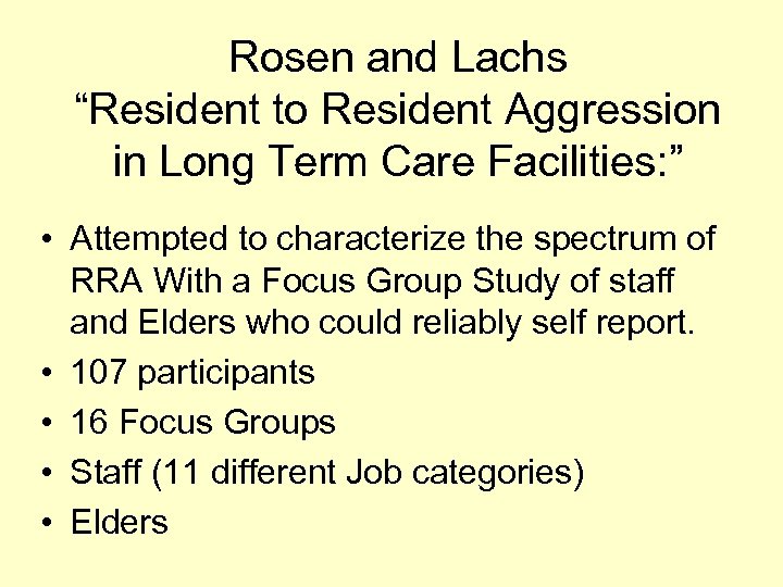 Rosen and Lachs “Resident to Resident Aggression in Long Term Care Facilities: ” • Attempted to characterize the spectrum of RRA With a Focus Group Study of staff and Elders who could reliably self report. • 107 participants • 16 Focus Groups • Staff (11 different Job categories) • Elders