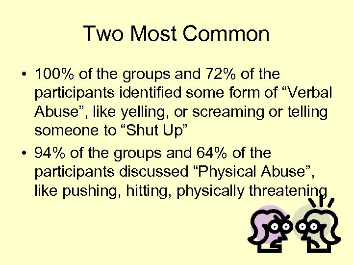 Two Most Common • 100% of the groups and 72% of the participants identified some form of “Verbal Abuse”, like yelling, or screaming or telling someone to “Shut Up” • 94% of the groups and 64% of the participants discussed “Physical Abuse”, like pushing, hitting, physically threatening