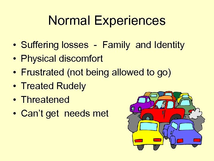 Normal Experiences • • • Suffering losses - Family and Identity Physical discomfort Frustrated (not being allowed to go) Treated Rudely Threatened Can’t get needs met