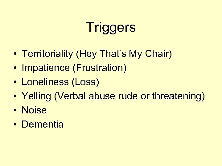 Triggers • • • Territoriality (Hey That’s My Chair) Impatience (Frustration) Loneliness (Loss) Yelling (Verbal abuse rude or threatening) Noise Dementia