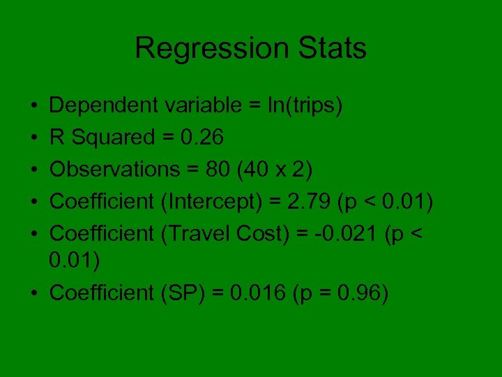 Regression Stats • • • Dependent variable = ln(trips) R Squared = 0. 26 Observations = 80 (40 x 2) Coefficient (Intercept) = 2. 79 (p < 0. 01) Coefficient (Travel Cost) = -0. 021 (p < 0. 01) • Coefficient (SP) = 0. 016 (p = 0. 96)