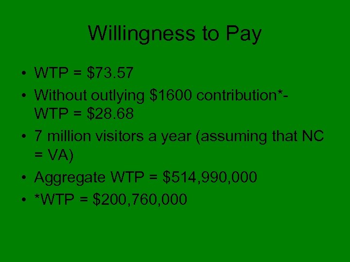Willingness to Pay • WTP = $73. 57 • Without outlying $1600 contribution*WTP = $28. 68 • 7 million visitors a year (assuming that NC = VA) • Aggregate WTP = $514, 990, 000 • *WTP = $200, 760, 000