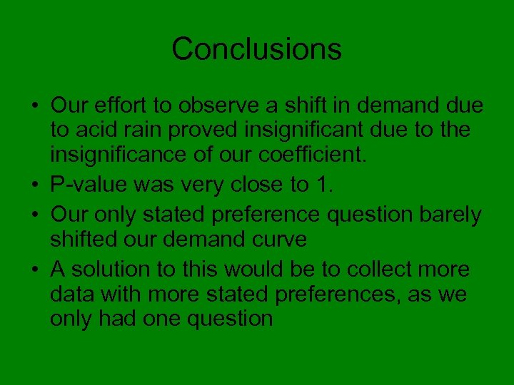 Conclusions • Our effort to observe a shift in demand due to acid rain proved insignificant due to the insignificance of our coefficient. • P-value was very close to 1. • Our only stated preference question barely shifted our demand curve • A solution to this would be to collect more data with more stated preferences, as we only had one question