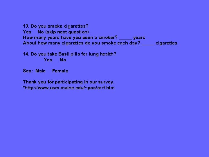 13. Do you smoke cigarettes? Yes No (skip next question) How many years have you been a smoker? _____ years About how many cigarettes do you smoke each day? _____ cigarettes 14. Do you take Basil pills for lung health? Yes No Sex: Male Female Thank you for participating in our survey. *http: //www. usm. maine. edu/~pos/arrf. htm